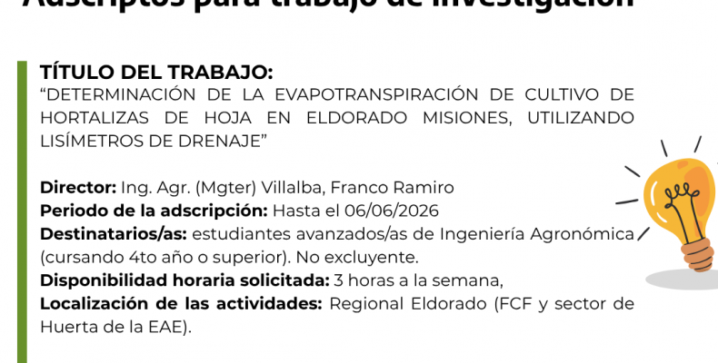 Se encuentra abierta la convocatoria a estudiantes avanzados/as de la carrera de Ingeniería Agronómica para incorporarse como adscriptos/as en el trabajo de investigación: “Determinación de la evapotranspiración de cultivo de hortalizas de hoja en Eldorado, Misiones, utilizando lisímetros de drenaje”, acreditado en el SASPI. La propuesta busca integrar conocimientos de agrometeorología,…