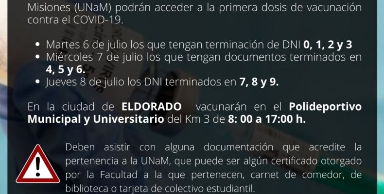 Los/as estudiantes de 18 años o más de la Universidad Nacional de Misiones (UNaM) podrán acceder a la primera dosis de vacunación contra el COVID-19. De acuerdo a lo informado por las autoridades y a partir de conversaciones con el Gobierno Provincial, los días, horarios y lugares serán los siguientes:…