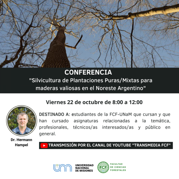 En el marco de la cátedra Silvicultura II de la carrera Ingeniería Forestal, se invita a participar este viernes 22 de octubre de 8:00 a 12:00 h de la conferencia “Silvicultura de Plantaciones Puras/Mixtas para maderas valiosas en el Noreste Argentino”.