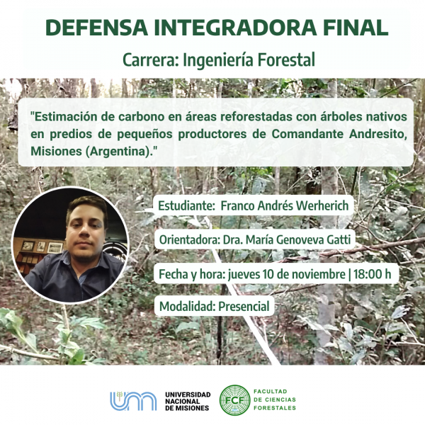 Este jueves 10 de noviembre a las 18:00 h, el estudiante Franco Andrés Werherich de la carrera Ingeniería Forestal defenderá su integradora final.