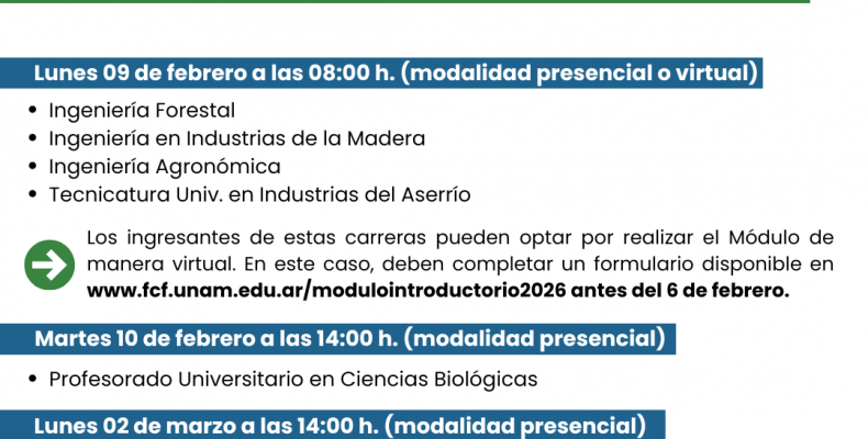 La Secretaría Académica informa las fechas de inicio de los módulos introductorios de las carreras que se dictan en Eldorado. Estos módulos constituyen instancias obligatorias y forman parte de los planes de estudio de cada carrera. Deben participar de ellos/as, quienes se hayan preinscripto o tengan intenciones de iniciar el cursado de estas propuestas formativas durante el ciclo lectivo 2026.