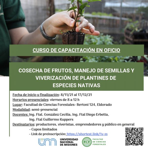 En el curso se brindarán conocimientos teórico-prácticos sobre el momento de cosecha, los métodos de cosecha de árboles, manejo de frutos y semillas de especies nativas, así como también sobre las estructuras, insumos de viveros y las condiciones para la producción de plantines nativos. Los docentes a cargo son los ingenieros Forestales: Cecilia González; Diego Erbettay Guillermo Kuppers.